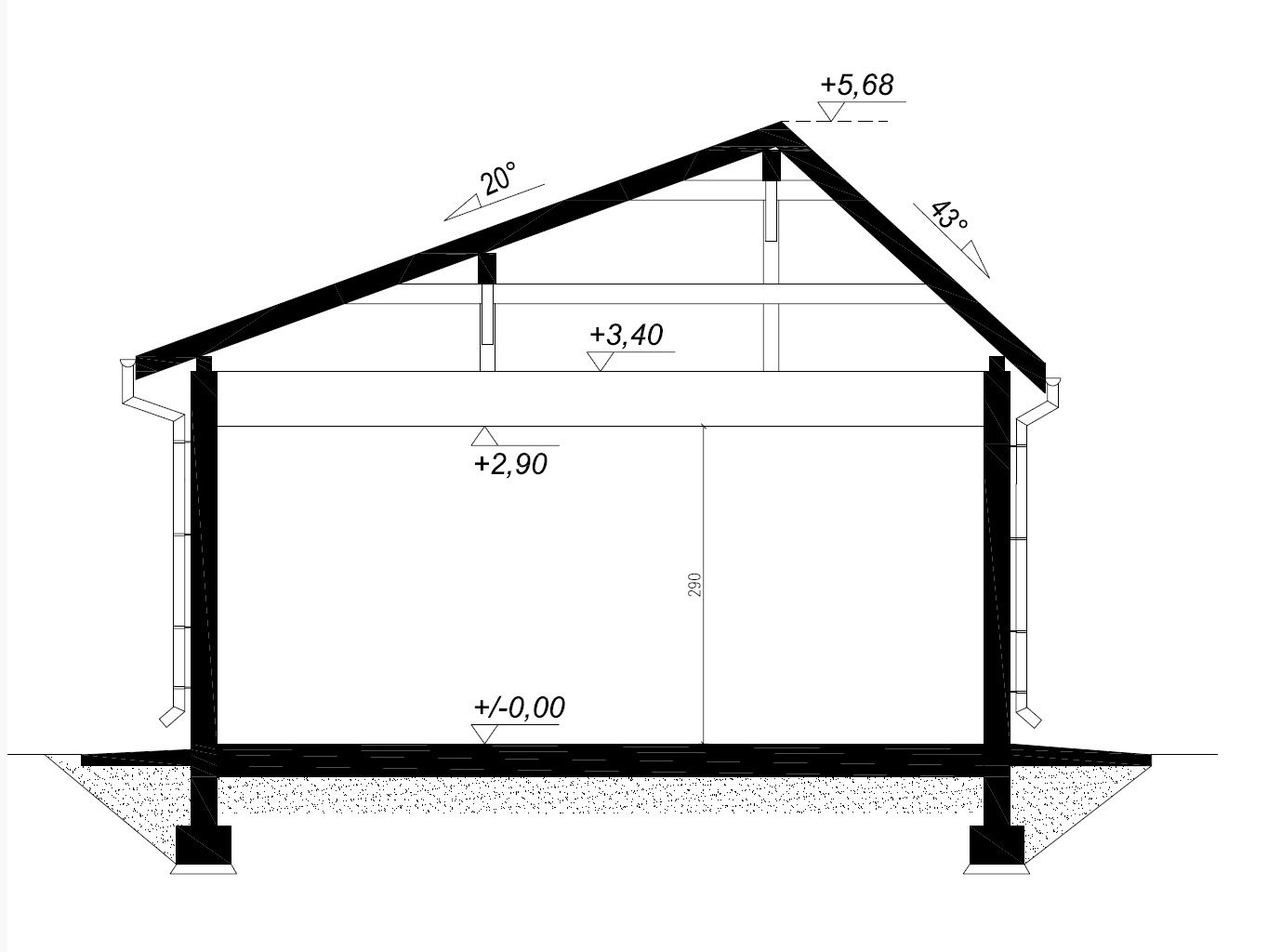 - Dach: dwuspadowy o kącie nachylenia 43° i 20 °