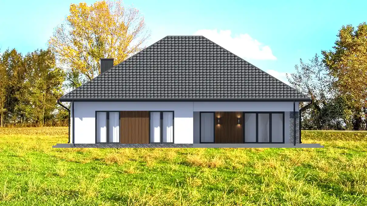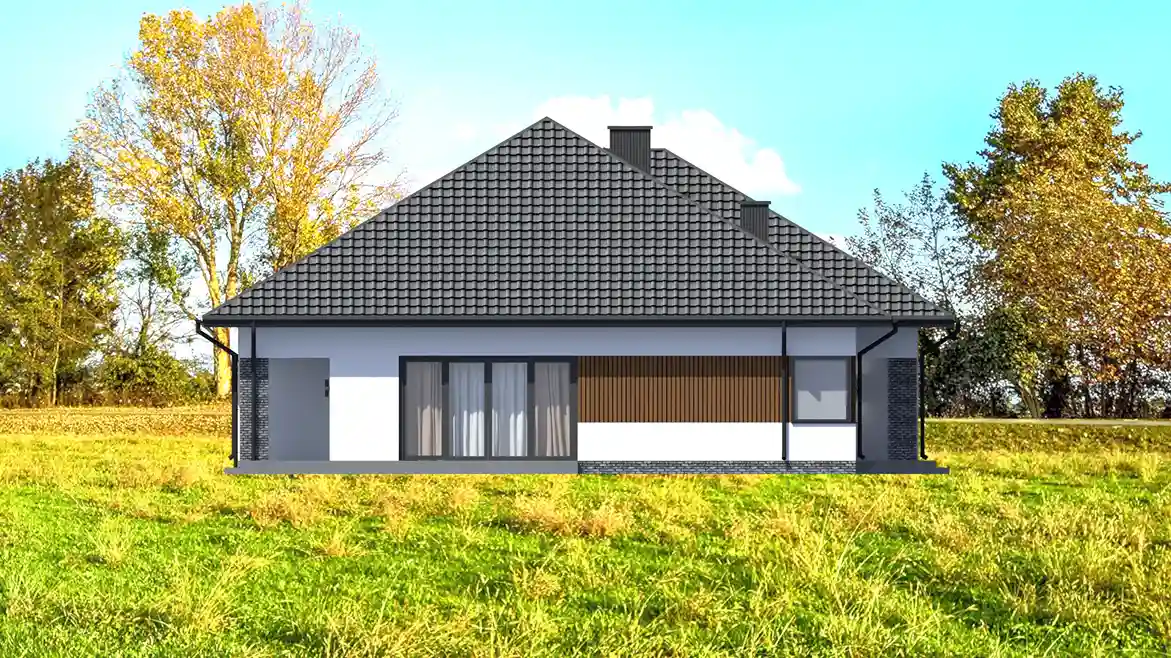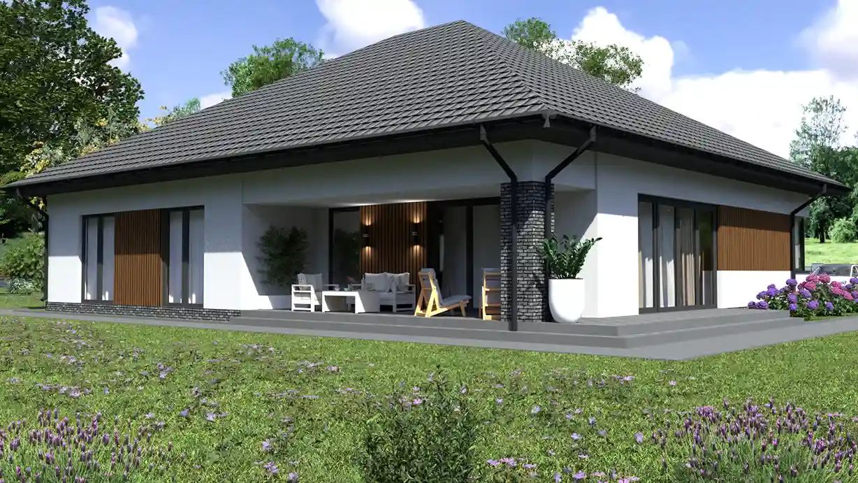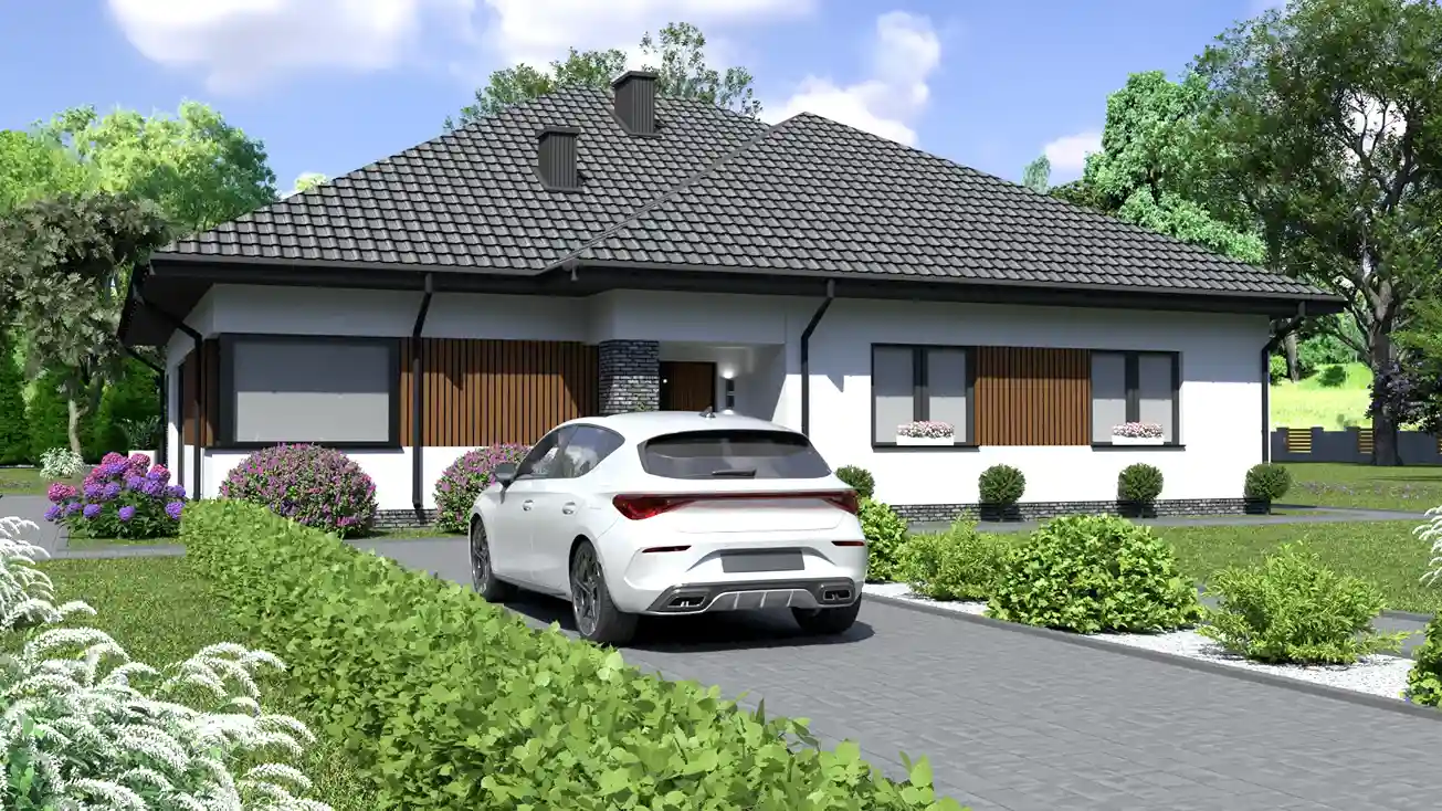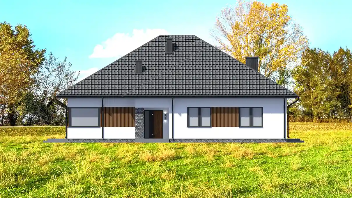 - Ściany zewnętrzne: pustak z betonu komórkowego 24 cm + wełna mineralna 12 cm + cegła ceramiczna 12 cm