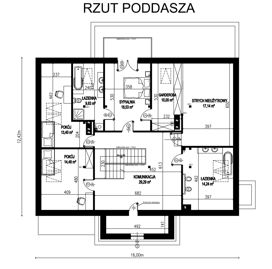 - Ocieplenie poddasza: wełna mineralna gr. 30cm