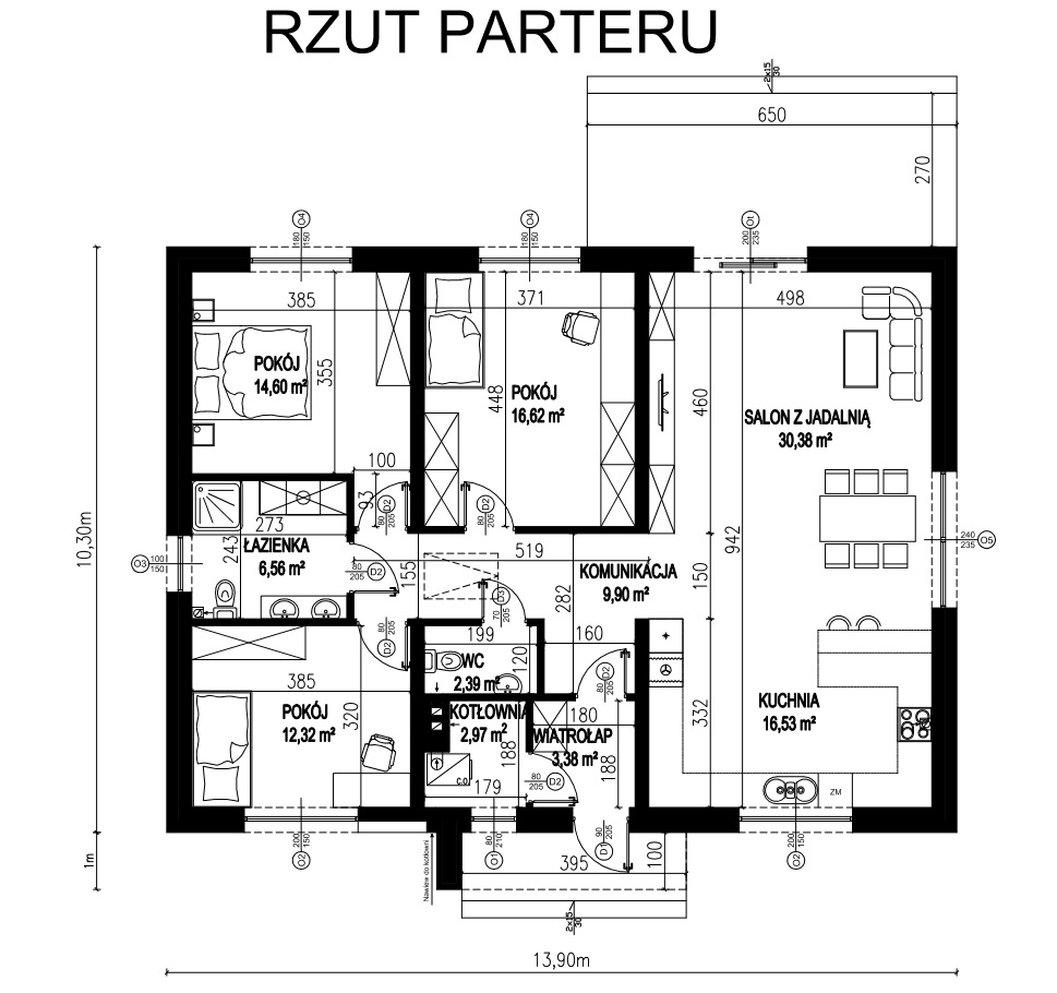 - Ocieplenie stropu: wełna mineralna gr. 30cm